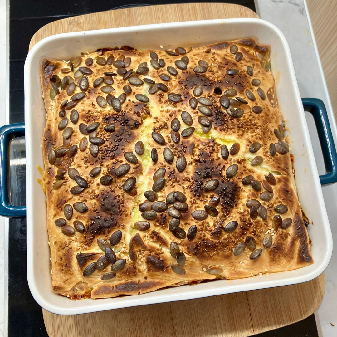 Place second layer of pastry on top of cheese. Drizzle/brush over a small amount of olive oil, sprinkle seeds on top.