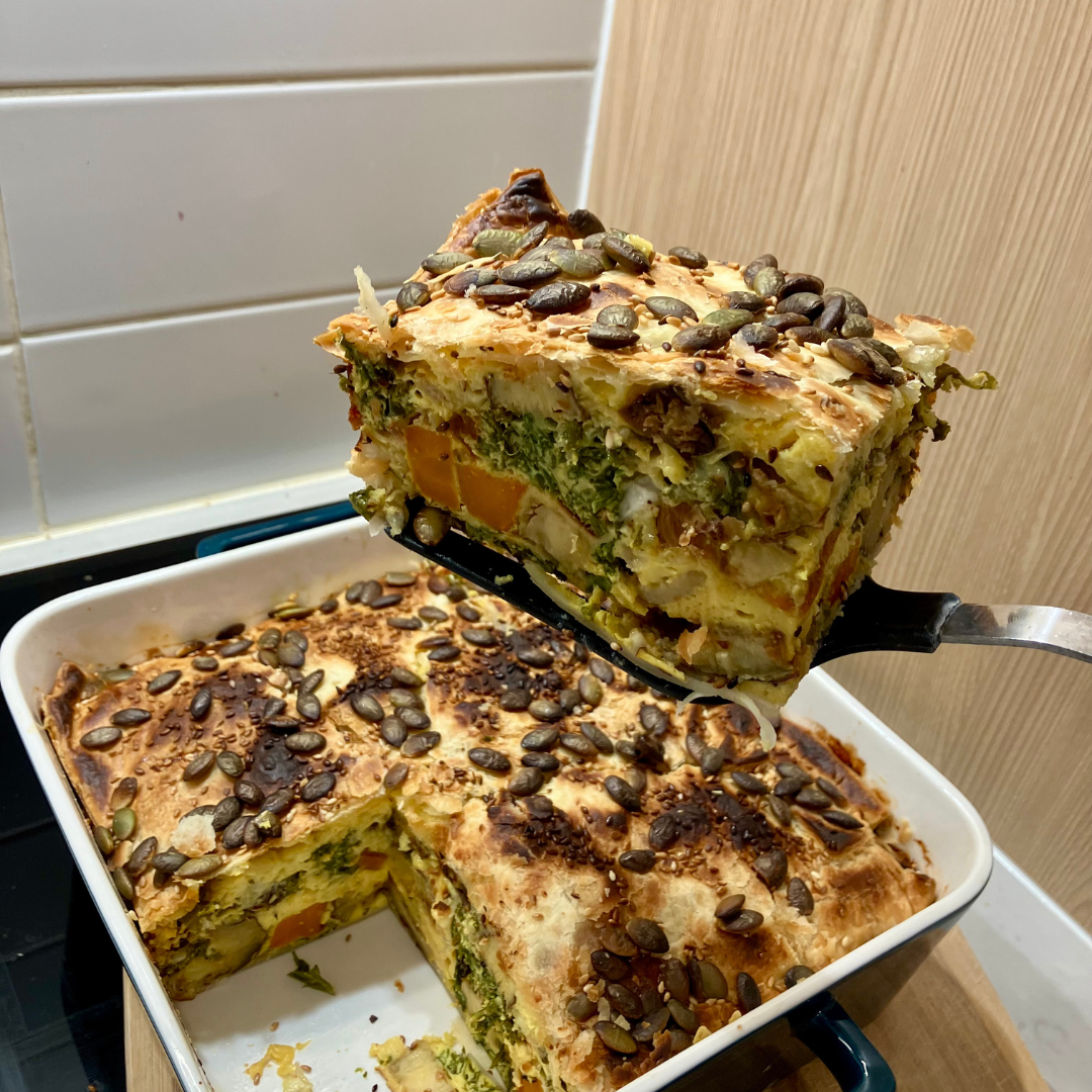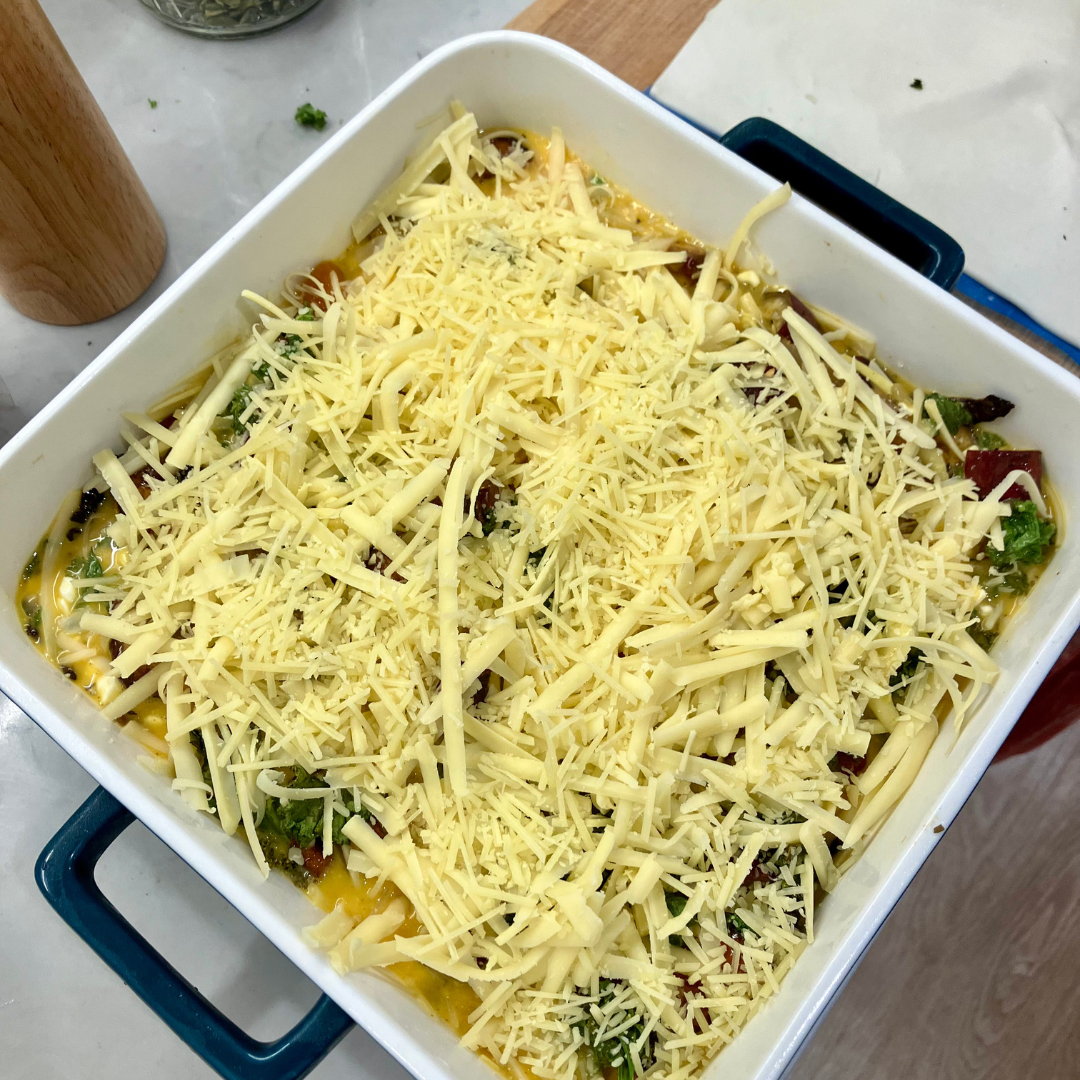 This vegetable-packed frittata is a great option for meal prep, offering a good dose of protein in every bite. Topped with a simple layer of pastry, cheese, and crunchy seeds, it’s a tasty and satisfying meal that is ideal for breakfast, lunch, or dinner.