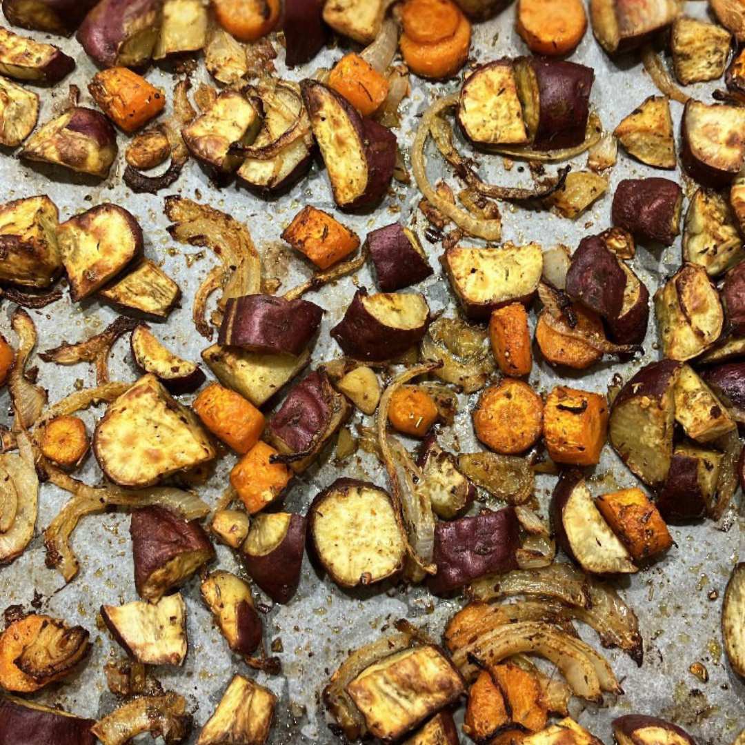 Preheat oven to 180°C. Transfer kumara, carrot, onion, and garlic on to a baking tray. Drizzle with olive oil and toss through herbs and spices.